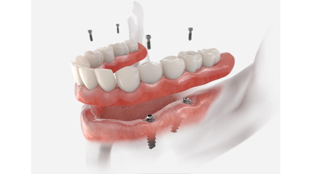 - Fitting of a custom-made full-arch prosthesis (fixed bridge or denture)